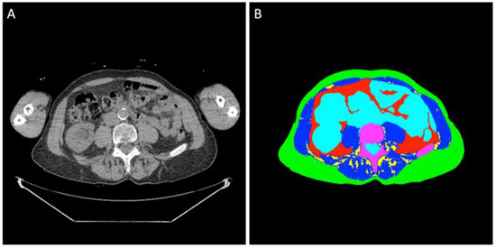 Regions of interest of the different tissues were determined at the midpoint of the L4 vertebral body using previously validated segmentation models [8]. A standard single slice was manually determined by one of the authors (MEG) with four years of experience in medical imaging and trained by senior fellowship-trained musculoskeletal radiologists (Figure 1). All segmentations were manually inspected and corrected, if necessary, by two of the authors (MEG and IZ) using Horos DICOM viewer version 3.3.6 (www.horosproject.com (accessed on 05/15/2024)). BC analysis was conducted blinded to clinical information and outcomes.