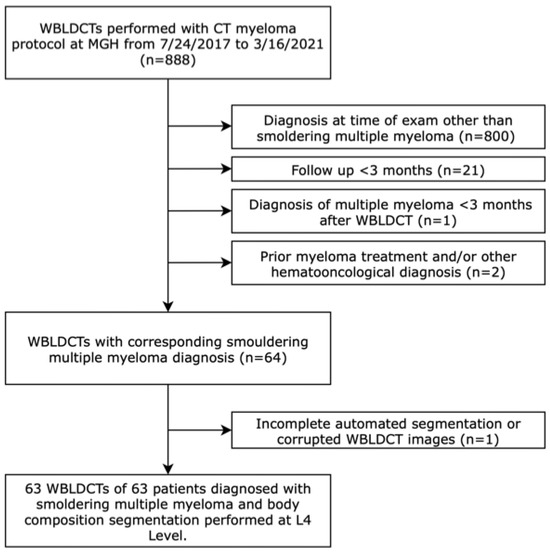 The Picture Archiving and Communication System of a tertiary care academic hospital was searched for consecutive WBLDCT scans performed between July 2017 and March 2021. Inclusion required a diagnosis of SMM at the time of WBLDCT, a follow-up period of more than 3 months, and no diagnosis of MM within three months following the WBLDCT. Incomplete imaging and prior myeloma treatment led to exclusion. Clinical data were collected from the electronic health record. Clinical information collected within 90 days of the WBLDCT exam included patient characteristics (age, sex, body mass index [BMI]), smoking status, and a diagnosis of diabetes mellitus type II. Positive smoking status was defined as ≥5 pack-years. Laboratory parameters included serum creatine, hemoglobin, m-protein, plasma cell infiltration, and SFLCR.