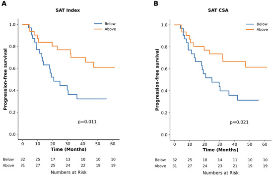 Time to progression (TTP) and subcutaneous adipose tissue cross-sectional area (SAT CSA) and index. (A) TTP (months) of subjects with SAT index above the sex-specific median compared to those below. (B) TTP (months) of subjects with SAT CSA above the sex-specific median compared to those below.