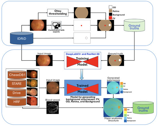Initially, the IDRiD dataset was utilized, providing pixel-level annotations for the OD and four DR lesion types. To generate the retinal region, Otsu thresholding was applied as described in [34]. Subsequently, the retinal and OD annotations were combined, and the FV region was manually edited using MATLAB’s Image Labeler [35] (MATLAB software, https://www.mathworks.com/products/matlab.html (accessed on 27 October 2025)), with careful investigation and validation by experienced ophthalmologists. The resulting background subclass annotations, including OD, FV, and the general retinal area, are conceptualized in Figure 1.