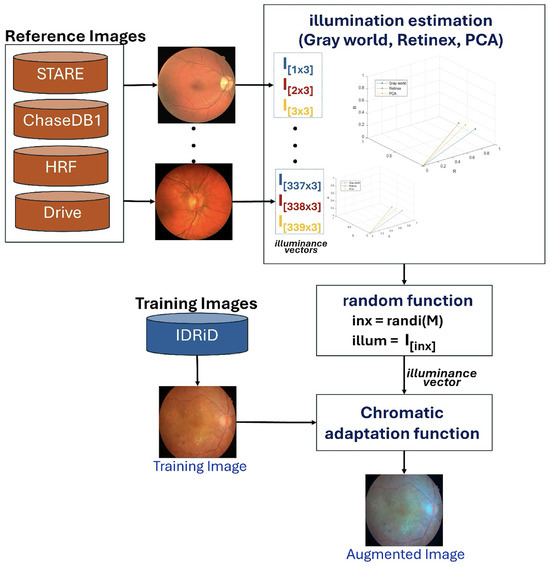 The augmentation process begins by pre-calculating an illuminance matrix (). This matrix is derived from 113 reference images collected from the STARE, Chase_DB1, HRF, and DRIVE datasets. For each of these 113 images, illuminance vectors are estimated using three established color constancy algorithms: Gray World, Retinex, and Principal Component Analysis (PCA) [40], resulting in a total of 339 illuminance vectors . During training, a distinct illuminance vector is uniformly and randomly selected from this pre-calculated matrix () for each of the 54 IDRiD training images. The selected training image is then rendered using a chromatic adaptation function, which applies the chosen illuminance vector to generate an augmented image with a different visual appearance. As illustrated in Figure 4, this process effectively simulates the scenario where an IDRiD image is captured by a different camera, such as one used for HRF images.