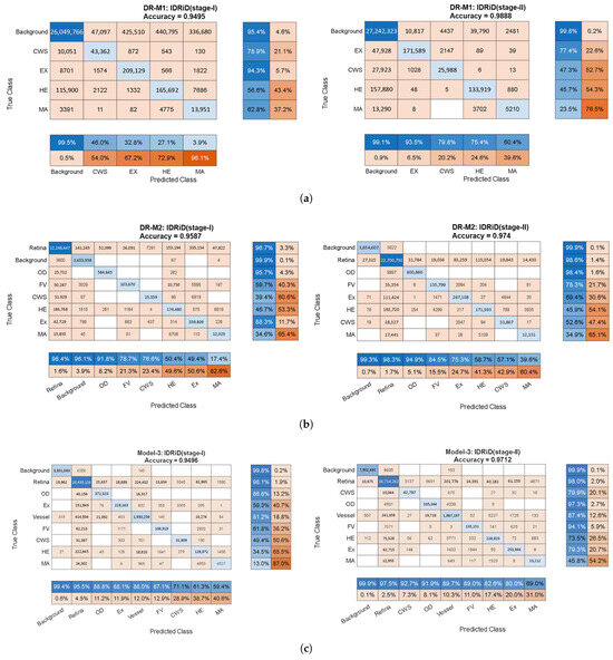 - Step 4: Multi-Class Integration for Lesion Segmentation. Finally, the anatomical structure annotations (optic disc, fovea, vessels, retina, background) were combined with the original DR lesion annotations (microaneurysms, hemorrhages, hard exudates, cotton-wool spots) to create a unified nine-class training dataset. This integration enabled the model to simultaneously learn lesion patterns and anatomical context, reducing false positives by explicitly modeling structures that could be confused with pathological features.