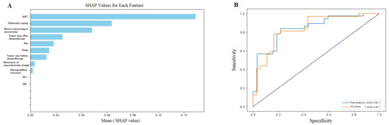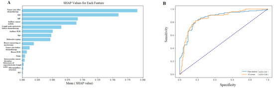 Model performance visualization showing: (A) SHAP value analysis of predictive features, where post-chemotherapy tumor size, Ki-67, and Miller–Payne grade emerged as the top contributing factors (mean SHAP values: 0.16, 0.17, and 0.09, respectively), and (B) ROC demonstrating robust model discrimination with AUC of 0.86 (95% CI: 0.81–0.92; sensitivity: 0.85, 95% CI: 0.81–0.89). AUC = area under the receiver operating curve.