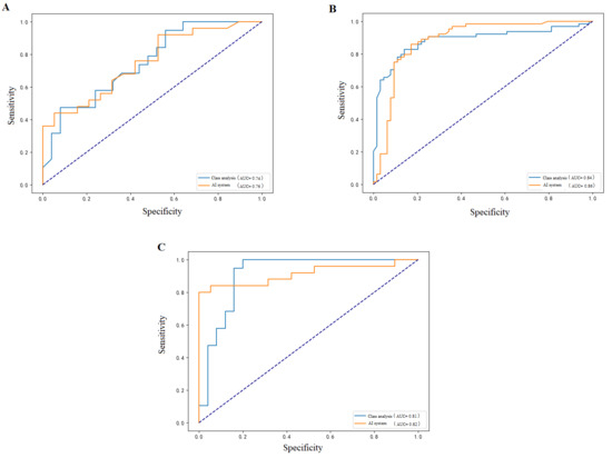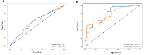 - Hanley, J.A.; McNeil, B.J. The meaning and use of the area under a receiver operating characteristic (ROC) curve. Radiology 1982, 143, 29–36. [Google Scholar] [CrossRef]