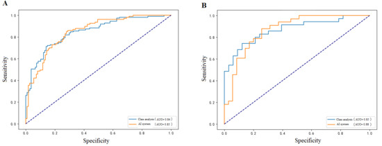 ROC curves illustrating the model’s predictive performance in different surgical groups: (A) mastectomy group with AUC of 0.85 (95% CI: 0.70–0.89), and (B) breast-conserving surgery group with slightly better performance (AUC of 0.88, 95%CI: 0.79–0.95).