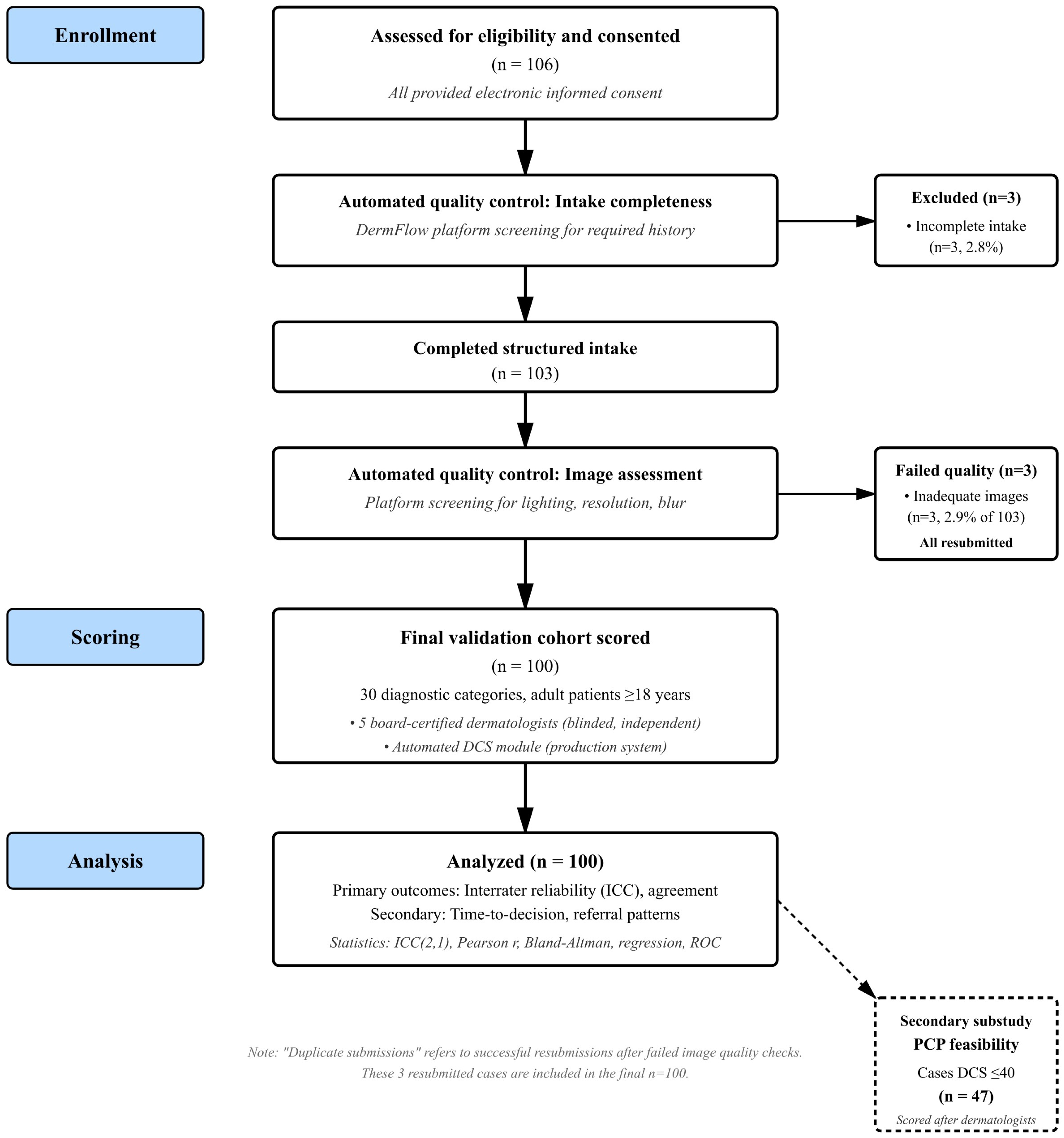 Each case contained a median of three photographs (IQR 2–4), reflecting typical patient submission patterns and providing multiple perspectives and anatomical views as clinically indicated. Consecutive submissions during the enrollment window were screened. Of 106 total screened submissions, all of whom signed consent, 3 (2.8%) were excluded for incomplete structured intake, leaving 103 that completed intake. Three cases were excluded for inadequate/blurred images (n = 3) and duplicate submissions (n = 3). These duplicate submissions and inadequate images were the same cases, as the platform requested a resubmission when the image quality check failed, leaving 100 total analyzed cases. All exclusions were automatically identified by the DermFlow platform’s quality control module prior to entry into the study queue. The platform employs automated quality checks for image resolution, lighting adequacy, and validation of the dermatologic nature of the image(s), prompting users to resubmit when standards are not met. This automatic filtering represents core functionality of the production system and is central to its real-world clinical utility. For this validation study, cases that failed automated quality checks and required resubmission were counted as exclusions. The three duplicate submissions were from the same patients whose initial images were flagged as inadequate and subsequently resubmitted with improved quality.