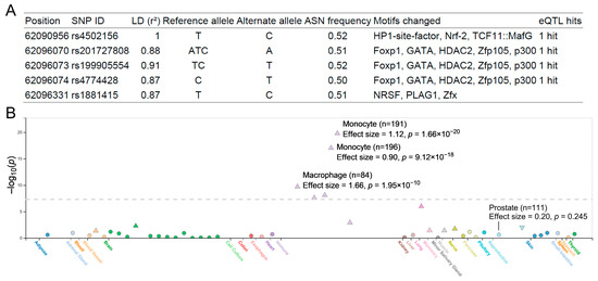 HaploReg analysis of rs4502156 annotated the variant and its linkage disequilibrium proxies as eQTLs that could potentially disrupt several transcription factor-binding motifs (Figure 2A). The FIVEx database analysis corroborated this finding, indicating that the protective C allele was strongly associated with increased C2CD4A expression in multiple immune cell types, particularly monocytes and macrophages (p < 5 × 10−8; Figure 2B). However, this association was not statistically significant in prostate tissue (p = 0.245).