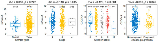 Association between C2CD4A mRNA expression and clinicopathological features of prostate cancer. Expression values (log2(x+1)-transformed RNA-Seq by expectation-maximization counts) were analyzed against the tumor stage, Gleason score, and disease progression status using data from The Cancer Genome Atlas prostate adenocarcinoma cohort. Lower C2CD4A expression was significantly associated with more aggressive disease.