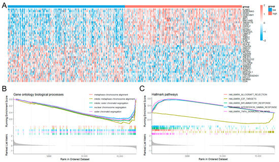 Gene Ontology annotation and pathway enrichment of genes associated with C2CD4A expression in prostate cancer. (A) Heatmap of the top 20 upregulated and downregulated differentially expressed genes between the high- and low-C2CD4A-expression groups in The Cancer Genome Atlas prostate adenocarcinoma cohort. (B) GSEA of Gene Ontology biological processes, highlighting the top five pathways enriched in the high-expression group. (C) GSEA of Hallmark pathways showing the top five enriched pathways, with E2F targets being the most significantly enriched gene set.