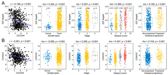 Clinical relevance of E2F pathway activity and CDKN2C expression in prostate cancer. (A) GSVA scores for E2F targets and (B) CDKN2C expression levels according to tumor stage, Gleason score, and disease progression status in The Cancer Genome Atlas prostate adenocarcinoma cohort. Both the E2F GSVA scores and CDKN2C expression levels were inversely correlated with the C2CD4A expression levels and elevated in more aggressive diseases. The blue regression line in scatter plots represents the best-fit linear model, and the shaded area indicates the 95% confidence interval.
