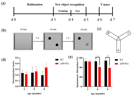 Cognitive function assessment of 3-, 6-, and 9-month-old WT and APP/PS1 mice (n = 8/group) (a) Schematic diagram of the experimental procedure for behavioral testing. (b) Diagram of New object recognition (NOR) testing. (c) Diagram of Y maze testing. (d) Discrimination index of NOR testing in 3-, 6-, and 9-month-old WT mice (black) and the same-month-old APP/PS1 mice (red). No significant change in the discrimination index was observed in either group of mice (n = 8 per group, per time-point). (e) Spontaneous alternation rate of Y maze testing in 3-, 6-, and 9-month-old WT mice (black) and the same-month-old APP/PS1 mice (red). n = 8 per group, per time-point. * p < 0.05, ** p < 0.01.