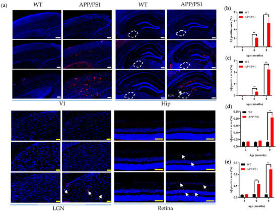The results (Table 1) showed that no amyloid plaques were detected in any examined region of WT mice aged 3–9 months (Figure 2a; Figure 2b–d, black bars). Compared with WT controls, amyloid plaque deposition was detectable in V1, the retina, and the hippocampus of AD model mice by 6 months of age (Figure 2a), with plaque burden increasing in an age-dependent manner (Figure 2a–c) and peaking at 9 months. Notably, the onset of Aβ plaques in V1 and the retina was synchronous with that in the hippocampus, and all three regions exhibited time-dependent accumulation of amyloid deposition. By contrast, pathological changes in the LGN appeared relatively delayed: no amyloid plaques were detected at 6 months, whereas a clear plaque distribution became apparent at 9 months (Figure 2d). Using 6 months as the reference time point, regional plaque burden followed the pattern V1 (2.09 ± 0.17, ~2%) > hippocampus (0.33 ± 0.05, ~0.33%) > retina (0.12 ± 0.01, ~0.12%) (Figure 2a–c,e). Moreover, the results showed that the amyloid burden in the V1 region was significantly greater than in the hippocampus and retina at both 6 and 9 months of age (Figure 4a).