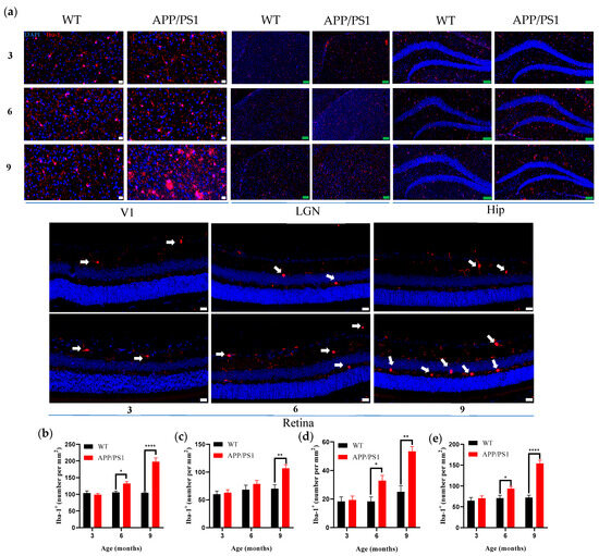 Results (see Table 1) showed that in wild-type mice, microglial density in nuclei along the primary visual pathway and in the hippocampus remained stable from 3 to 9 months, with no significant age-related changes (Figure 3a; Figure 3b–e, black bars). Consistent with the pattern of Aβ pathology, APP/PS1 mice showed a significant increase in the density of Iba-1–positive cells in V1 and the hippocampus beginning at 6 months (* p < 0.05, vs. age-matched WT), with a clear age-dependent upward trajectory (Figure 3a; Figure 3b,e, red bars). Notably, the microglial response in the LGN was relatively delayed, with a significant increase in Iba-1–positive cells observed only at 9 months (Figure 3a,c). The retina likewise exhibited increased microglial density at 6 months, which progressed further with disease advancement (Figure 3a,d). Furthermore, the results showed that the proliferation of microglia in the V1 region was significantly higher than in the hippocampus and retina at both 6 and 9 months of age (Figure 4b).