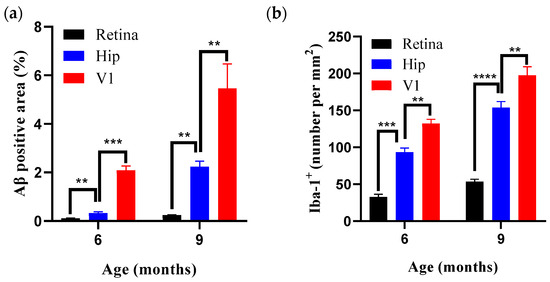 Region- and age-dependent differences in Aβ plaque burden and microgliosis in APP/PS1 mice. (a) Aβ plaque burden in APP/PS1 mice across different brain regions (V1, Hippocampus, Retina) and ages (6- and 9-month). (b) microgliosis in APP/PS1 mice across different brain regions (V1, Hippocampus, Retina) and ages (6- and 9-month). n = 7 per group. ** p < 0.01, *** p < 0.001, **** p < 0.0001.