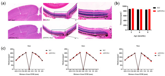 The above results indicate that pathological alterations emerge relatively early in V1 and the retina within the primary visual pathway during the AD course. To determine whether these pathological changes are accompanied by structural alterations, we employed HE staining to perform morphological assessments of the V1 cortex and retina in APP/PS1 transgenic mice and wild-type controls aged 3–9 months, focusing on thickness changes. The results showed no evident atrophic changes in the V1 cortex of APP/PS1 mice; cortical thickness did not differ significantly from age-matched WT controls (Figure 5b). For retinal thickness evaluation, we measured total retinal thickness. Given physiological regional differences, to ensure accuracy and reproducibility we used the optic disc as a reference point and measured full-thickness retina at 0.5, 1.0, 1.5, and 2.0 mm on either side of the disc. Morphometric analysis indicated that retinal thickness in APP/PS1 mice showed no significant disease-related changes at any measured site and did not differ statistically from age-matched controls (Figure 5c).