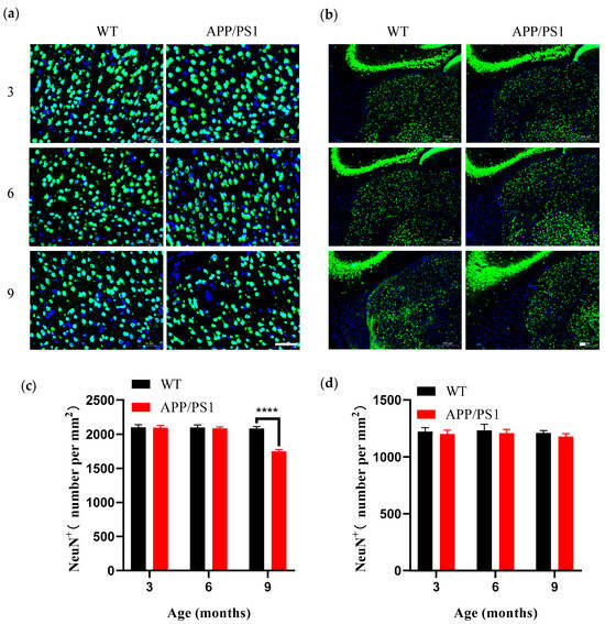 Building on the above finding that V1 exhibits selective vulnerability within the visual pathway, we further investigated differential pathological vulnerability among neuronal subpopulations in V1. We used the neuronal nuclear marker NeuN (neuronal nuclei) to assess overall neuronal density, which primarily reflects changes in excitatory pyramidal neurons that constitute about 80% of cortical neurons. In parallel, given that parvalbumin-positive (PV+) interneurons are the most abundant subtype of GABAergic interneurons (~40–50%) and play a critical role in maintaining cortical network function, we chose PV as a representative interneuron marker to evaluate how inhibitory neurons respond to AD pathology. Immunohistochemical analyses showed no age-related neuronal loss in WT mice between 3 and 9 months of age. However, in 9-month-old APP/PS1 mice, A significant reduction in NeuN+ neuronal density (cells/mm2) was observed in the V1 of APP/PS1 mice compared with WT controls (Figure 6a,b), indicating that when amyloid plaque burden reaches a high level (>5% of cortical area), V1 undergoes marked neuronal loss, a change that largely reflects damage to the predominant pyramidal neuron population. By contrast, no corresponding decrease in neuronal density was observed in the LGN of APP/PS1 mice (Figure 6c), corroborating the region-specific nature of neurodegeneration.