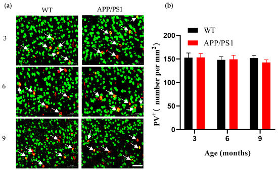 Number of PV+ neurons in V1 from 3-, 6- and 9-month-old WT and APP/PS1 mice (a) Immunofluorescent staining for PV+ neuron (red) and NeuN+ (green) in the V1 of mice (WT group, APP/PS1 group) at 3, 6, and 9 months of age. The white arrow points to PV+ neurons identified by NeuN+ colocalization, Scale bar, 50 μm. (b) Number of PV+ neurons per mm2 in V1 of WT mice (black, n = 6) and APP/PS1 mice (red, n = 7).