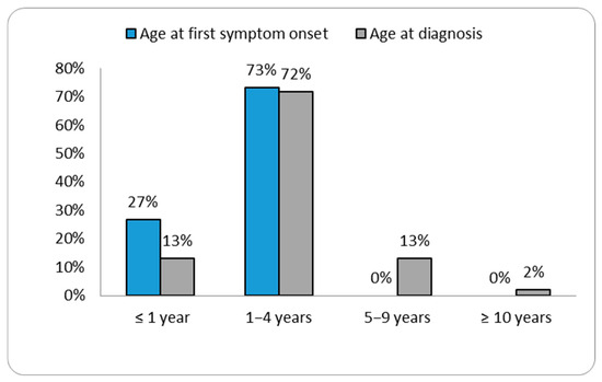 Distribution of cases according to the age at first symptom and age at diagnosis.