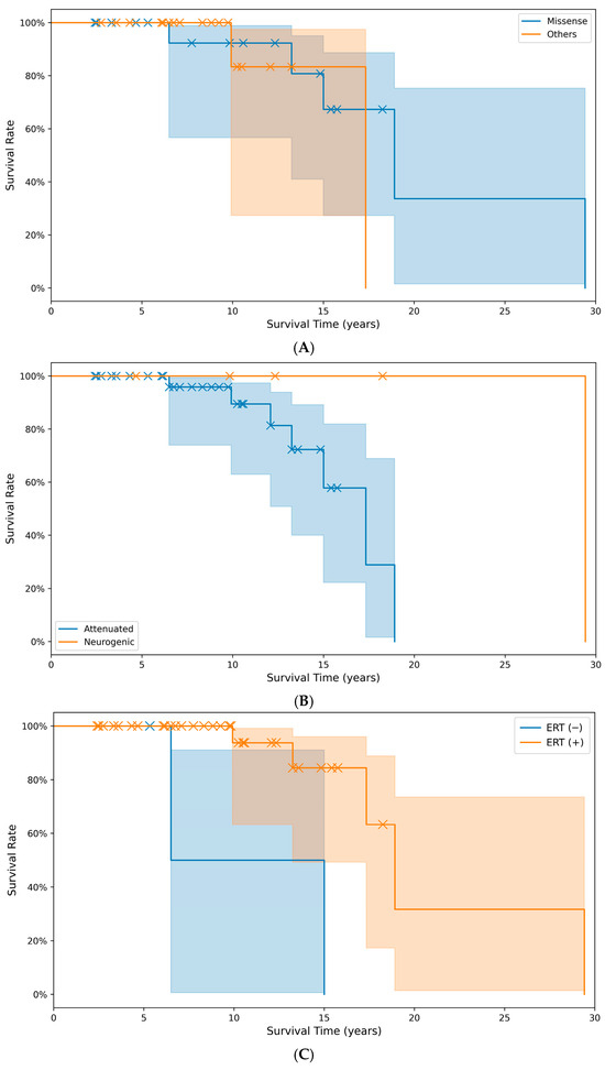 Comparison of cumulative survival rates and survival times across different groups: (A) between pathogenic variant types (p = 0.059), (B) between phenotypes (p = 0.079), and (C) between treatment groups with or without ERT (p = 0.004). X markers indicate events. (Note: A survival event occurred at month 353, beyond the main data range visualized here in (C)).