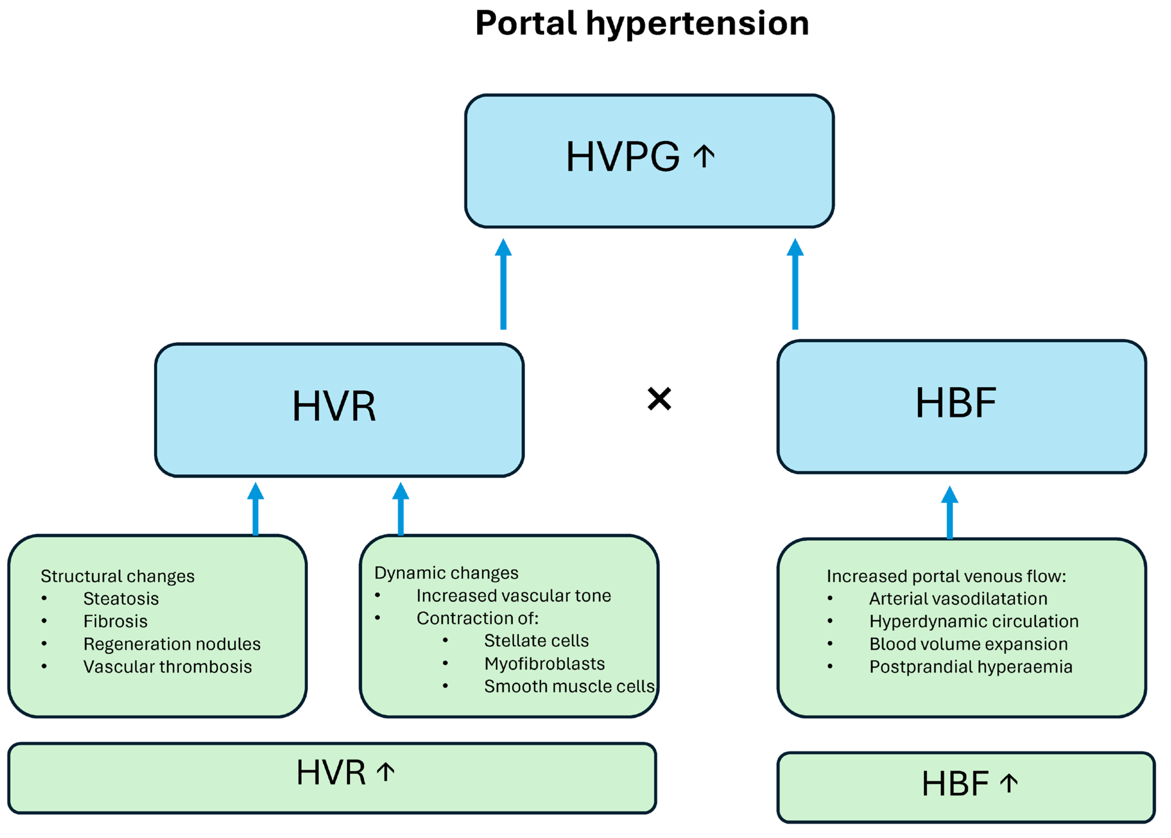 At its core, portal hypertension arises from increased resistance to portal blood flow through the liver and increased portal venous inflow. According to Ohm’s law applied to the vascular system (ΔP = Q × R), the portal pressure (ΔP) is the product of portal blood flow (Q) and intrahepatic resistance (R). Therefore, both an increase in portal venous inflow and in the hepatic vascular resistance (HVR) contribute to the elevated portal pressure. HVR is composed of both static components, such as fibrosis, steatosis, and nodular regeneration in cirrhosis, and dynamic components, including active vasoconstriction mediated by hepatic stellate cell activation [