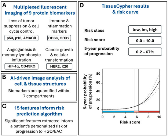 The tissue systems pathology test (TSP-9; TissueCypher) is an AI-powered test that was created to improve risk stratification in patients with BE and provide clinicians with a personalized, rather than a population-based, approach to objectively predict which of their patients with BE are at a high risk of progressing to HGD/EAC within 5 years [23,24,25,26,27,28,29,30].