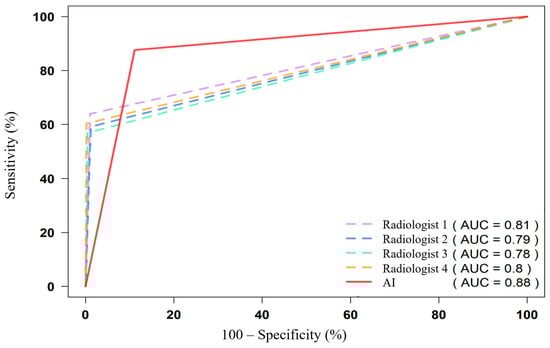 Diagnostic performance of the AI system and radiologists was quantified using the area under the ROC curve (AUC, 95% CI via DeLong) []. For each of the 16 pathologies, True positives (TP), false positives (FP), true negatives (TN), and false negatives (FN) counts were recorded, and classification errors stratified as minor, intermediate, or major.