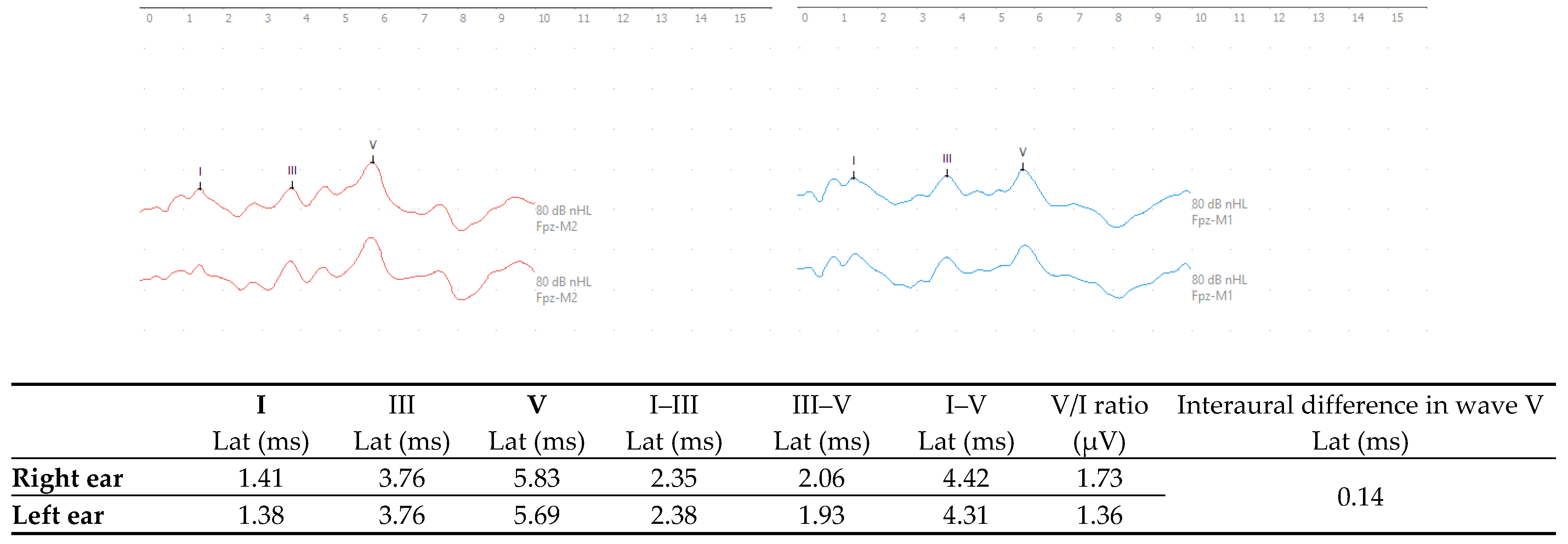 - Sanfins, M.D.; Colella-Santos, M.F.; Ferrazoli, N.; Rezende, A.; Donadon, C.; Gos, E.; Skarżyński, P.H. Latency and Interpeak Interval Values of Auditory Brainstem Response in 73 Individuals with Normal Hearing. Med. Sci. Monit. 2022, 28, e937847. [Google Scholar] [CrossRef] [PubMed]