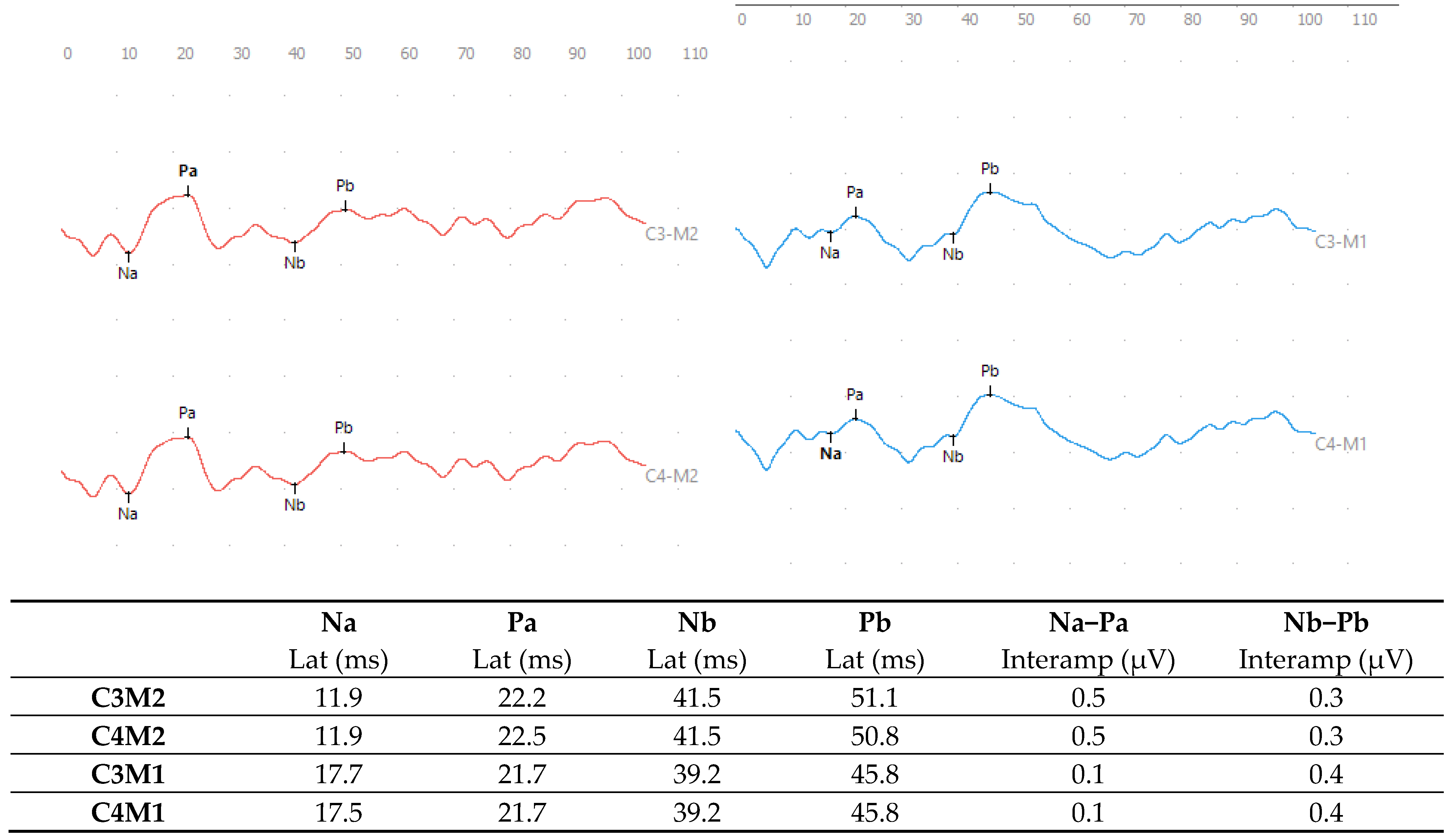| MLAEP | M1, M2, C3, C4, Fz | 70 dB HL | 20–1500 Hz | 20–200 Hz | NeuroAudioTM—Neurosoft, Ivanovo, Rússia | Insert (ER-3A) |