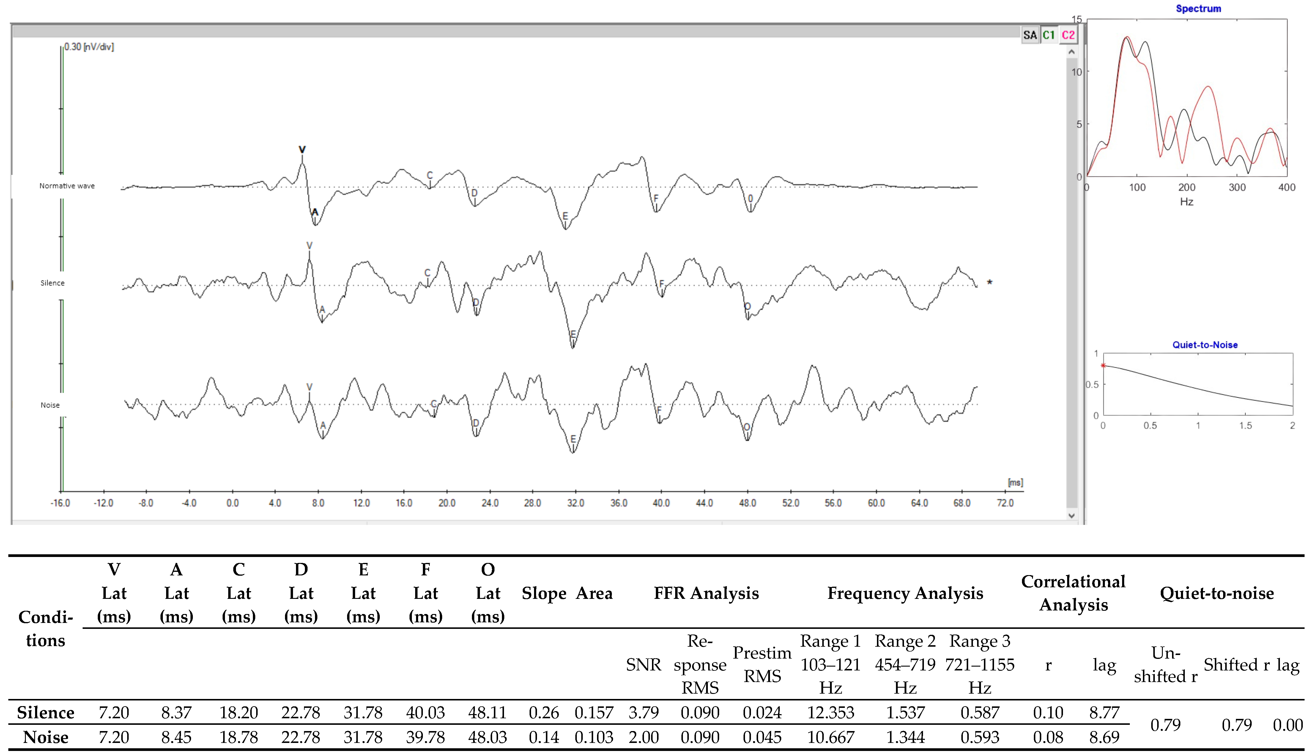 | c-ABR | M1, M2, Fz | 80 dB HL | 1–30 Hz | no filter | NeuroAudioTM—Neurosoft, Ivanovo, Rússia | Insert (ER-3A) |