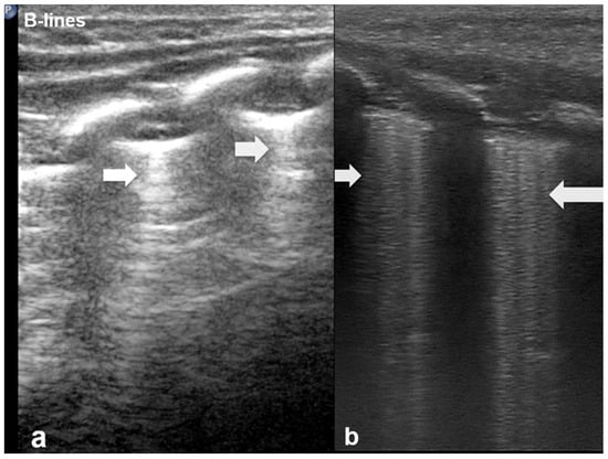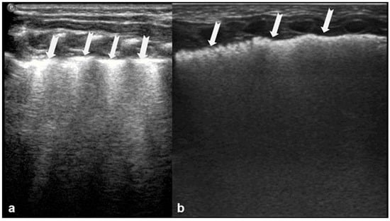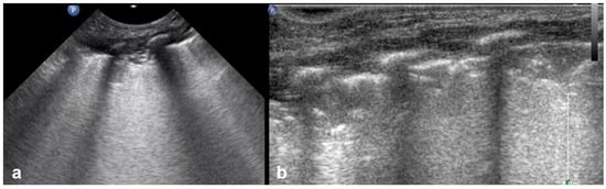B-lines are vertical reverberation-like hyperechoic artifacts seen during LUS imaging which originate from the pleural line and extend to the bottom of the imaging field without fading in intensity (Figure 2a). B-line artifacts move in synchrony with lung sliding and intersect horizontal A-lines, effectively obscuring them. Their presence is typically associated with fluid accumulation in the alveoli or interstitial space, and they are commonly referred to as ultrasound lung comets. However, B-lines are frequently observed in neonates and can appear as a normal finding within the first 24 to 48 h after birth [,,]. During LUS imaging, identification of up to two B-lines at the lung base is considered to be normal, while the presence of three or more B-lines between the intercostal space in a single view is considered significant and indicative of an underlying pathology. If multiple B-lines are identified by LUS, then the patient likely suffers from interstitial syndrome. When the air content in the lungs decreases, the number of lines tends to increase, because of the associated increase in lung density. Moreover, when the identified B-lines are confluent, this is an indication that the alveoli are filled with sub-pleural fluid. When interstitial edema is present, the presence or absence of B-lines can guide the administration of fluids [,,,]. However, it should be noted that B-lines are absent in the aforementioned pneumothorax.