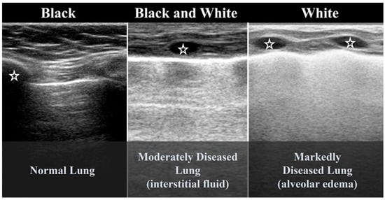 According to severity of the lung or interstitial pathology, B-lines may be solitary, few, multiple or even coalescent (Figure 2b), resulting in three imaging patterns associated with increasing severity: black lung, black and white lung, or white lung (Figure 3) [,].
