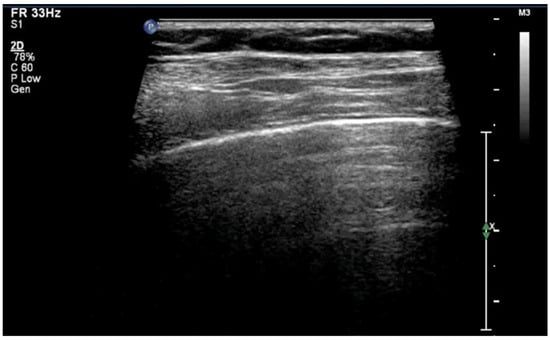 The pleural line (Figure 4) appears as a bright, horizontal echo on LUS images and marks the boundary where tissue from the chest wall contacts the lungs. This echogenic line results from the significant difference in acoustic impedance between the soft tissues of the chest wall, such as muscle and subcutaneous fat, which are fluid-filled, and the air-filled lungs. It represents the interface between the parietal and visceral pleura [,,,,].