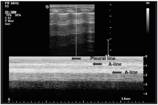 A-lines are horizontal, bright, echogenic lines that appear at equal intervals below the pleural line, running parallel to it (Figure 1). They are reverberation artifacts caused by the reflection of ultrasound waves between the pleura and the ultrasound probe. Although their presence typically indicates well-aerated, healthy lung tissue, A-lines can also be seen in certain pathological conditions, such as pneumothorax, where free air is present. Thus, A-lines are not always necessarily a sign of normal, healthy lungs [,,,,,,].