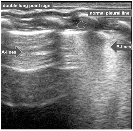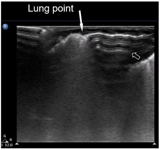 The “lung point” or “lung point sign” is a highly specific lung sonographic sign which helps in the diagnosis of pneumothorax and can also facilitate the assessment of pneumothorax severity. In particular, the severity of pneumothorax depends on its position relative to the anatomical lines that define the regions of the chest. In LUS, the “lung point” is defined as the boundary between the area without normal lung sliding (i.e., pneumothorax) and the area where normal lung sliding is present (normal lung) (Figure 8) [,,,,,].