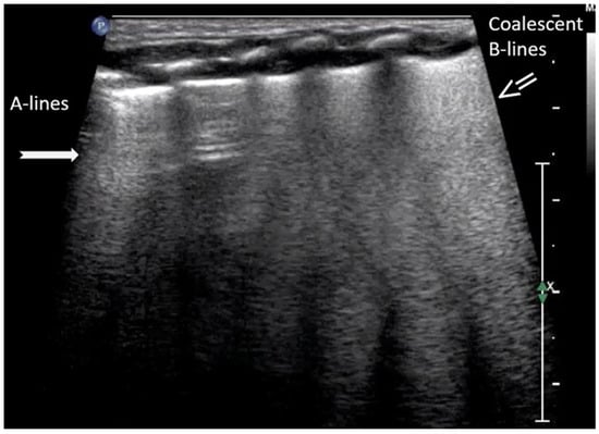 Double-lung-point sign: Normally aerated upper lung fields (arrow) and lower lung zones with multiple confluent B-lines (open arrow).