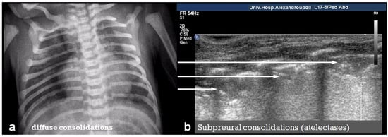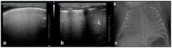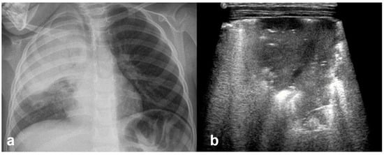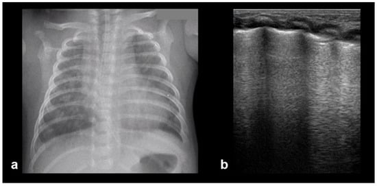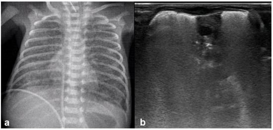 Chest X-rays are considered to be the most useful and valuable imaging modality for the diagnosis of lung diseases. However, X-rays cause radiation damage to patients, and neonates, infants and children are more susceptible to radiation damage because they have rapidly dividing cells that are less efficient at repairing mutated DNA []. Thus, LUS has been increasingly used in clinical practice as an alternative imaging application. Numerous studies have shown that LUS is a “baby-friendly” method that can provide accurate and reliable diagnosis and allow for the follow-up monitoring of lung diseases, especially in the context of neonatal patients [,].