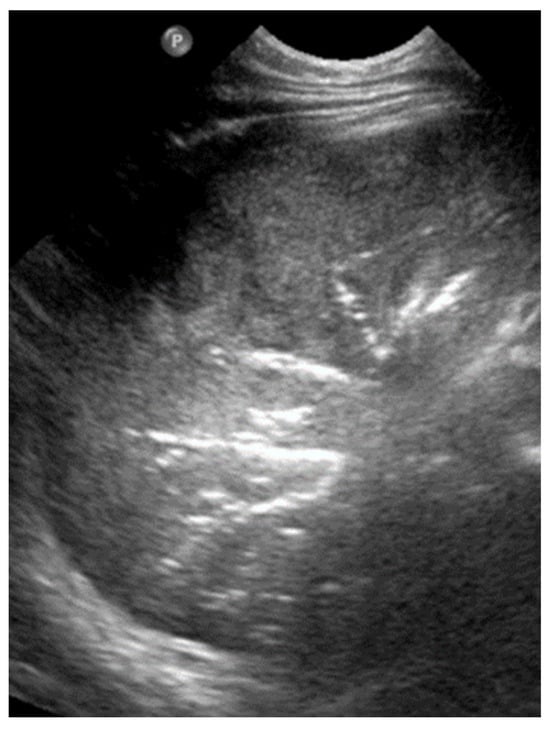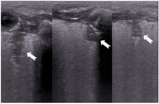 Pneumonia is also identified by the appearance of an irregular echogenic artifact, known as the “shred sign”, which is created by the inhomogeneous interface between consolidated (non-ventilated) and aerated lung tissue (Figure 21) [,,,,].