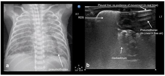 Interstitial emphysema shown on chest x-ray (a) and LUS (b). This case underlines the superiority of CXR in differentiating this pathology from RDS, which has a similar LUS appearance.