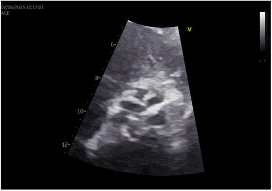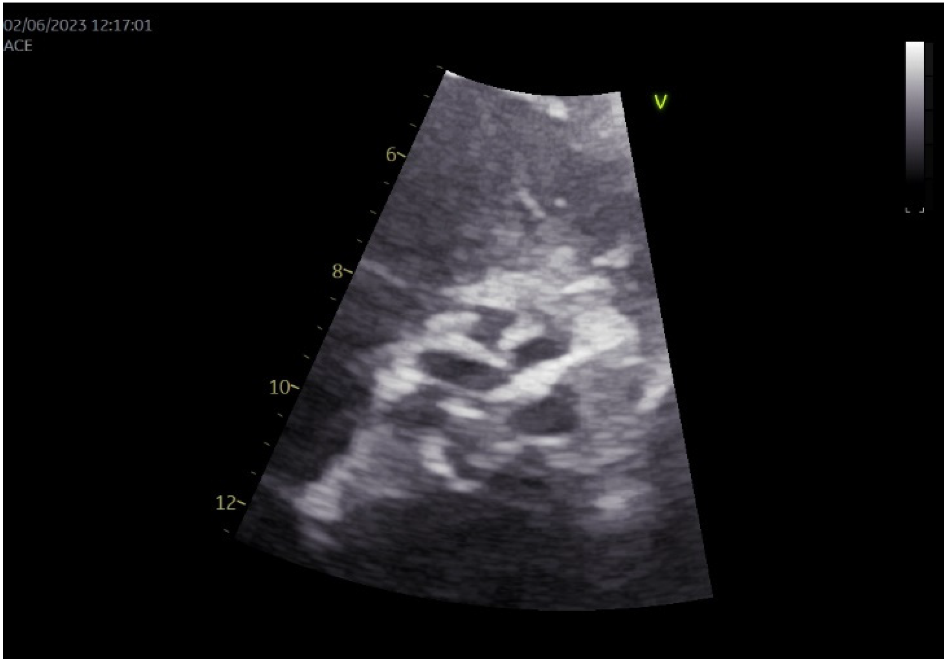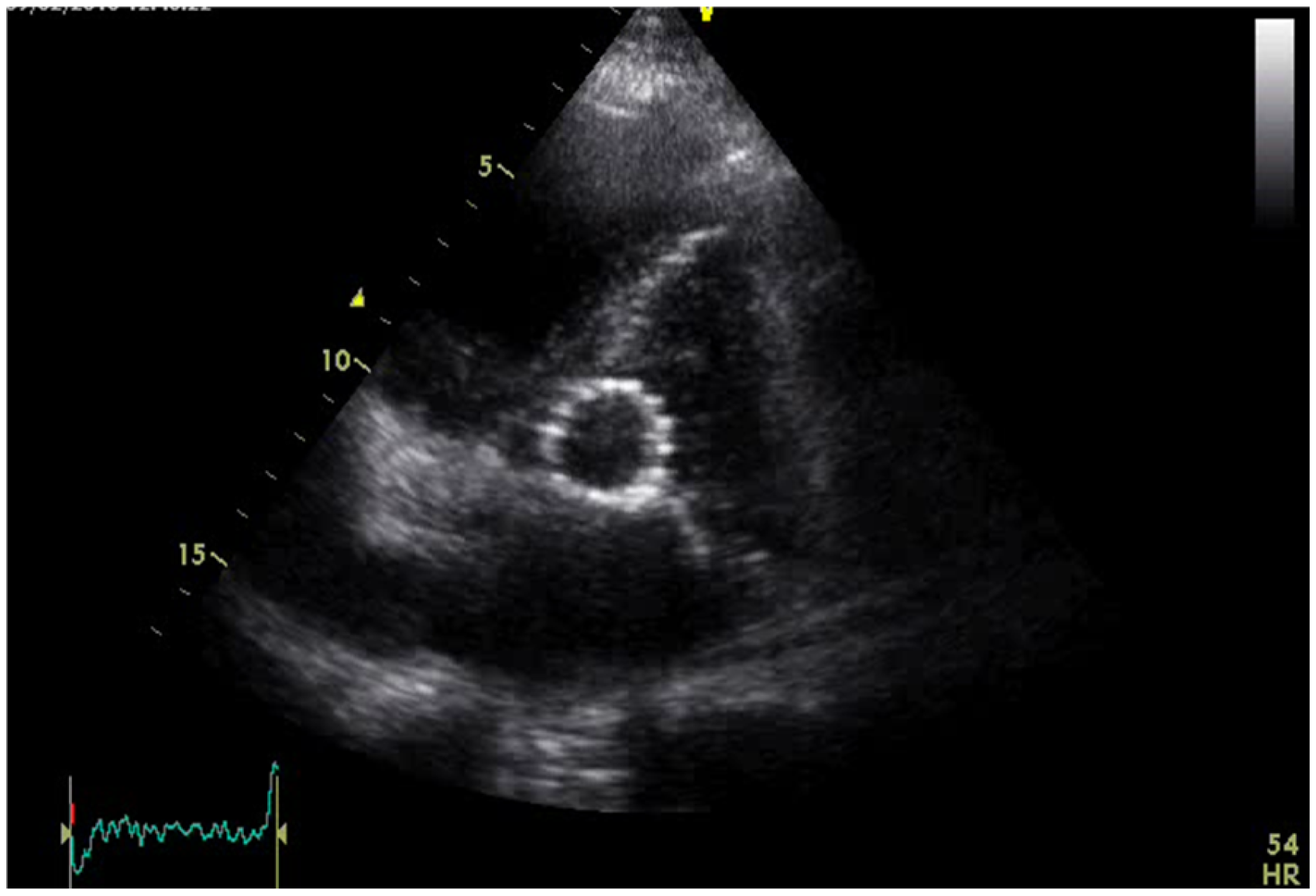 A focused transthoracic echocardiographic examination using GE® Vivid E95 (GE HealthCare, Chicago, IL, USA) in the short-axis view demonstrated a heavily calcified aortic valve.