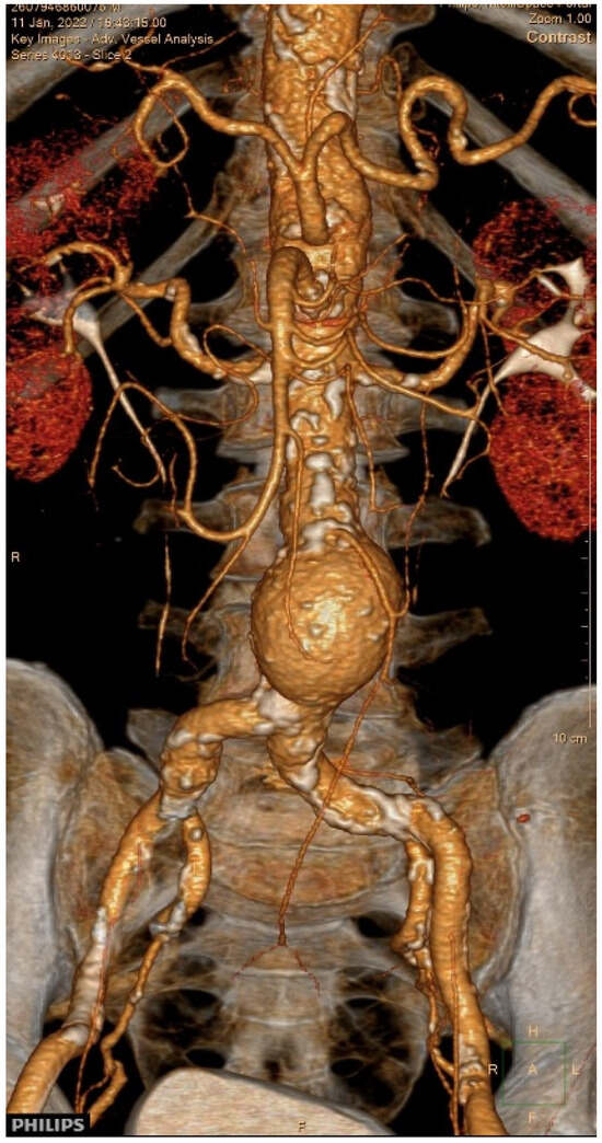 As part of the pre-procedural evaluation for TAVR, computed tomography (CT) of the aorta was performed, which incidentally identified an AAA measuring 46 mm in diameter (Figure 2).