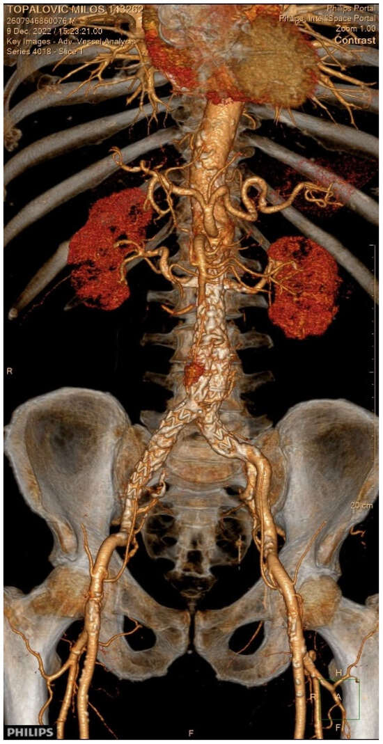 Subsequently, EVAR was performed, achieving optimal prosthesis positioning and satisfactory angiographic results. Hemostasis was achieved by direct suture closure of both femoral arteries. At hospital discharge, the patient was prescribed the following therapy: acenocoumarol 4 mg adjusted according to the INR target range between 2 and 3; bisoprolol 5 mg, half a tablet twice daily; spironolactone 100 mg, half a tablet daily (In combination with furosemide as Edemid forte); sacubitril/valsartan 51 mg/49 mg, two tablets twice daily; empagliflozin 10 mg once daily; furosemide 10 mg once daily; ranolazine 10 mg, two tablets daily (at 13:00 and 18:00); and rosuvastatin 20 mg once daily.