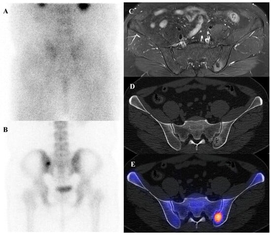 Osteoblastoma is a rare bone-forming tumor with a male predilection, most commonly occurring in the second to third decades of life. Its essential imaging features are a lytic lesion larger than 2 cm with well-defined borders and without permeation of the host bone. Osteoblastoma, a larger and more aggressive counterpart of osteoid osteoma, is histologically similar but shows greater growth potential with high vascularity and osteoblastic activity [,]. Consequently, they are intensely metabolically active and demonstrate markedly elevated [18F]FDG uptake on PET/CT [,]. Published reports document a wide range of high SUVmax in osteoblastomas, with averages around 3.2 in some series, individual cases reaching 6.2, and some spinal lesions exhibiting SUVmax as high as 16.0 [,,,]. This level of [18F]FDG avidity is well within the range of, and often exceeds that of, many malignant bone sarcomas. This significant overlap renders [18F]FDG PET incapable of reliably differentiating a benign osteoblastoma from a malignancy based on the intensity of uptake alone. The diagnosis relies on integrating the PET findings with the characteristic radiographic appearance and location. Figure 5 illustrates a case of osteoblastoma in the iliac bone, where bone scintigraphy, MRI, and SPECT/CT together demonstrated the characteristic features of this entity.