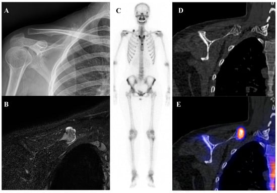A 16-year-old female with osteochondroma of the right scapula. (A) Plain radiograph shows a protruding mixed sclerotic mass at the scapular cap. (B) T2-weighted fat-suppressed magnetic resonance imaging demonstrates a pedunculated, lobulated osseous lesion arising from the scapular cap, with continuity of the cortex and medulla and a thin, T2-bright enhancing cartilaginous cap. (C) Bone scintigraphy shows focal uptake at the lesion site. (D,E) Bone single-photon emission tomography/computed tomography demonstrates focal tracer uptake at the bone–cartilage junction.