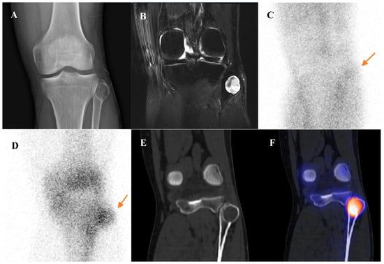 Aneurysmal bone cyst is an expansile, blood-filled, osteoclastic giant cell-rich tumor of bone. It is commonly seen in patients younger than 20 years and typically occurs in the long bones, spine, and pelvis [,,,,]. The classic finding on bone scintigraphy is the “doughnut sign,” which consists of a ring of intense tracer uptake in the hypervascular fibrous septa and reactive bone at the periphery of the lesion, surrounding a central photopenic (cold) core that corresponds to the blood-filled cystic cavity []. Figure 9 demonstrates a representative case of an ABC in the proximal fibula, showing a multiloculated cystic mass with fluid–fluid levels on MRI, a sharply defined expansile lucency on radiograph, and peripheral tracer uptake on bone scintigraphy and SPECT/CT. While this sign is characteristic, it is not specific to ABC. It can also be seen in other lesions with central necrosis or cystic change, including giant cell tumor, chondroblastoma, and even telangiectatic osteosarcoma []. [18F]FDG uptake in an ABC is variable []. In primary ABCs, uptake is typically confined to the solid peripheral components. If the ABC is secondary to another underlying tumor or antecedent trauma, the [18F]FDG avidity will largely reflect the metabolic activity of that primary lesion [,,].