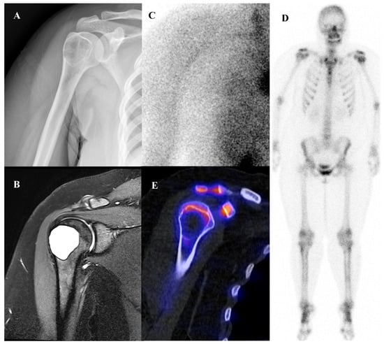 Osteochondroma is the most common benign bone tumor, typically arising in the metaphyses of long bones and most frequently diagnosed in patients younger than 20 years []. On bone scintigraphy, the osseous portion of an osteochondroma accumulates tracer. Particularly intense tracer uptake is observed at the bone–cartilage junction of osteochondromas where active endochondral ossification is taking place []. The primary role of nuclear medicine is in the surveillance for malignant transformation to a secondary chondrosarcoma, a rare but serious complication. A sudden, marked, and heterogeneous increase in tracer uptake in a previously stable osteochondroma, particularly in an adult, is highly suspicious for malignant change []. [18F]FDG PET/CT is superior to bone scintigraphy for this purpose, as a significant increase in SUVmax provides a more specific and quantifiable marker of malignant transformation than a general increase in osteoblastic activity. Osteochondromas generally show no or faint [18F]FDG uptake, with approximately one-third of patients showing uptake higher than that of the background [,,]. Figure 6 illustrates a typical case of scapular osteochondroma, in which MRI, bone scintigraphy, and SPECT/CT demonstrated the characteristic features of this lesion.