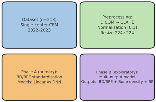 Study workflow: dataset, preprocessing, and artificial intelligence models. The single-center dataset (n = 213, contrast-enhanced mammography [CEM], years 2022−2023) underwent standardized preprocessing (DICOM conversion, CLAHE, intensity normalization, resizing). In Phase A, linear regression and deep neural network (DNN) models were trained to predict breast density (BD, BI-RADS A−D) and background parenchymal enhancement (BPE, minimal–marked). Phase B explored a multi-output architecture linking BD/BPE with systemic surrogates (bone density and systolic blood pressure).