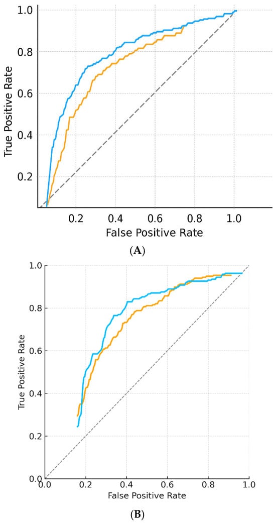 ROC curves. (A) Receiver operating characteristic (ROC) curves for internal test set performance. Both linear regression and DNN models outperformed chance, with area under the curve (AUC) values of approximately 0.73 and 0.75, respectively, for standardized BD/BPE classification. ROC = receiver operating characteristic; AUC = area under the curve; DNN = deep neural network; BD = breast density; BPE = background parenchymal enhancement. (B) Receiver operating characteristic (ROC) curves for external validation using the VinDr-Mammo dataset (n = 500, BI-RADS C/D). Linear regression and DNN models demonstrated stable generalization with AUC ≈ 0.74 and 0.75, respectively. ROC = receiver operating characteristic; AUC = area under the curve; DNN = deep neural network.