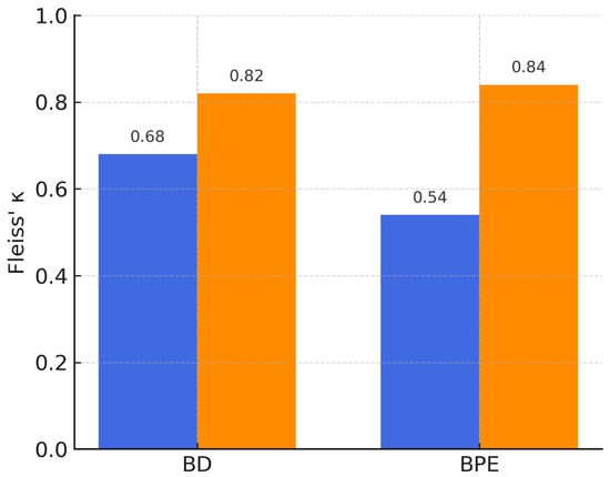 Inter-reader agreement was quantified using Fleiss’ κ. Initial inter-reader agreement was moderate for BPE (κ = 0.54) and substantial for breast density (κ = 0.68). The consensus session established the ground truth labels used for model training and testing.