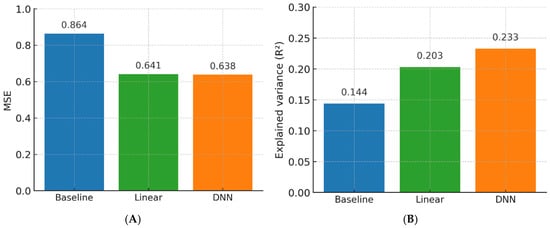 The same preprocessing and training pipeline described in Section 2.3 was applied. Performance was assessed with regression metrics (mean squared error and explained variance) for the surrogate predictions, alongside standard classification metrics for BD and BPE. Given the exploratory nature of this experiment, no model selection or hyperparameter optimization beyond the base architecture was performed.