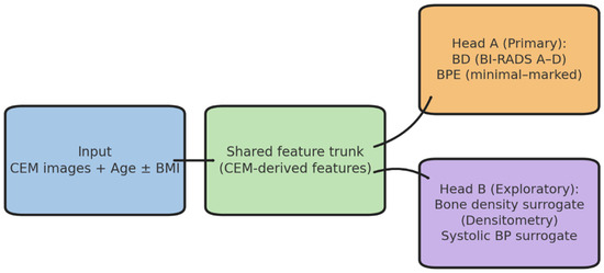 In parallel, an innovative line of research explores the possibility of extending CEM analysis beyond the breast-specific domain. Since BPE reflects vascularization and hormonal activity, it has been hypothesized that a single CEM scan might also encode information relevant to systemic biomarkers. Parameters such as bone mineral density and blood pressure, strongly related to aging and hormonal metabolism, are independent risk factors for osteoporotic fractures and cardiovascular complications in women [21,22,23,24,25]. However, traditional linear regression methods fail to capture the complex and non-linear interactions among these factors [26]. Multi-output deep learning models, on the other hand, can simultaneously integrate imaging and clinical variables into a single frame-work, identifying synergistic patterns without sacrificing interpretability [27,28,29,30].